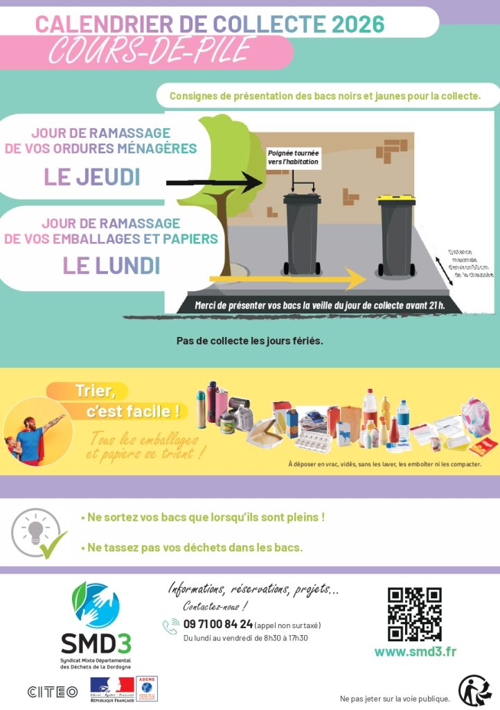 Calendrier de collecte 2026 disponible en cliquant ici: https://smd3.fr/collecte-des-dechets/